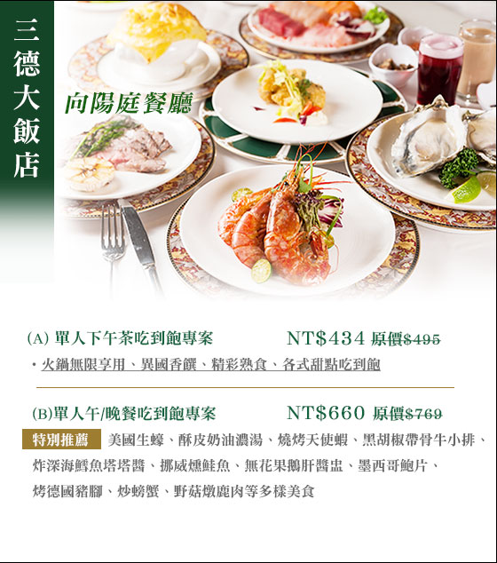 商品訊息簡述: 吃到飽!只要434元起即可享有【三德大飯店《向陽庭餐廳》】原價最高769元單人吃到飽:(A)下午茶專案/(B)午/晚餐專案,特別推薦:美國生蠔、酥皮奶油濃湯、挪威燻鮭魚、無花果鵝肝醬盅、墨西哥鮑片、烤德國豬腳、炒螃蟹、野菇燉鹿肉、黑胡椒牛排、炸鮮蝦佐芒果醬、乳酪焗菠菜扇貝等多樣美食?
