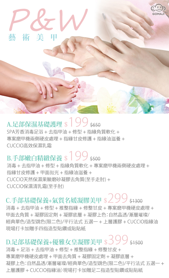 消毒 + 足浴 + 去指甲油 + 修型 + 推整指緣 + 修整甘皮 + 專業磨甲機硬皮處理 + 甲面去角質 + 凝膠固定劑 + 凝膠底層 + 凝膠上色:自然晶透/漸層璀璨/經典單色/造型跳色(限二色)/平行法式 五選一 + 上層護膠 + CUCCIO指緣油,現場打卡加贈足二指造型貼鑽或貼貼紙