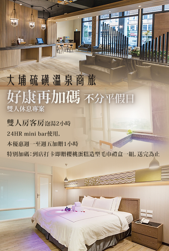 只要980元,即可享有【金山萬里-大埔硫磺溫泉商旅】好康再加碼~不分平假日~雙人休息專案〈含雙人房客房休息2小時 + 24HR mini bar使用,本優惠週一至週五加贈1小時〉特別加碼:到店打卡即贈櫻桃蛋糕造型毛巾禮盒一組,送完為止